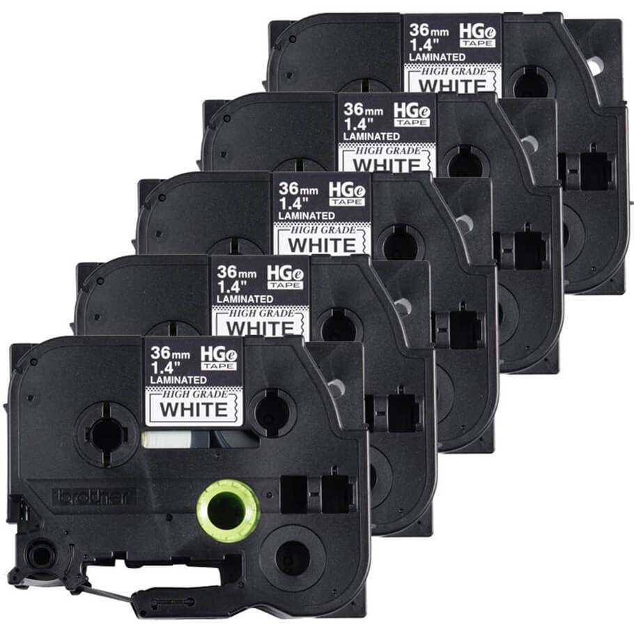 Bộ 5 cuộn nhãn Brother HGE-2615PK chữ đen trên nền trắng, kích thước 36 mm x 8 m, mang đến chất lượng in cao cấp với độ bám dính tiêu chuẩn, lý tưởng cho các bề mặt phẳng và nhẵn. Ứng dụng công nghệ cán phủ bảo vệ (Laminated) độc quyền của Brother, sản phẩm có khả năng chống phai, chống trầy xước, chịu được nước, hóa chất và nhiệt độ khắc nghiệt – hoàn hảo cho cả môi trường trong nhà lẫn ngoài trời.