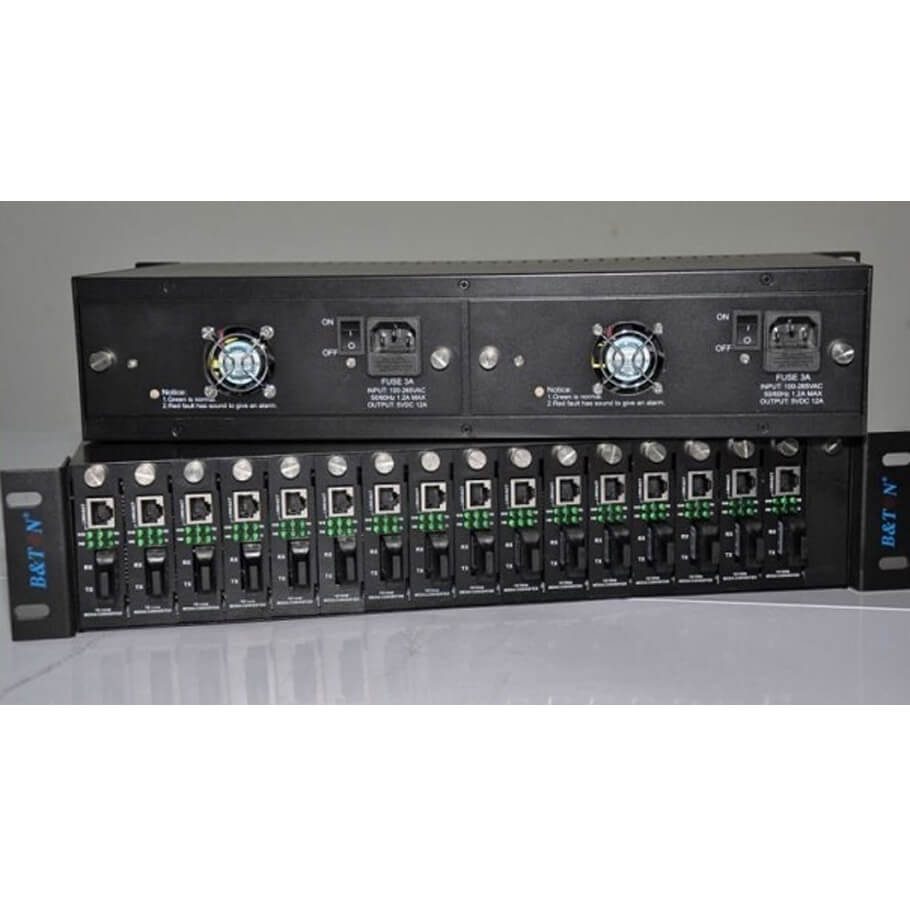 - Thiết kế rack 2U – 16 khe cắm card: Cho phép lắp đặt đồng thời tối đa 16 bộ media converter dạng card.