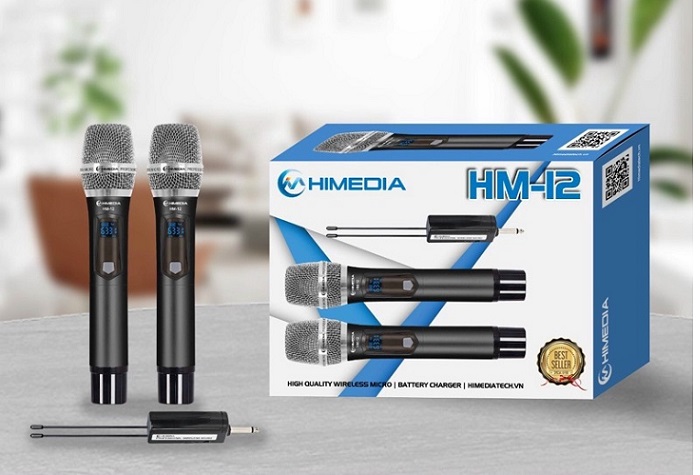 - Micro karaoke không dây Himedia HM12 được thiết kế nhỏ gọn với 2 tay mic và 1 bộ đầu chuyển thu tín hiệu người dùng có thể dễ dàng kết nối với các thiết bị ngoại vi như: loa bluetooth, loa kéo, amply, vang cơ, vang số thậm chí là bàn mixer,…