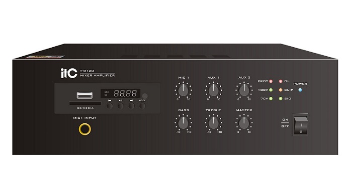 - Amply T-B120 là dòng Amply ITC đa năng 120W hỗ trợ nhiều ngõ vào cho Mic và có khả năng kết nối Bluetooth, USB để phát nhạc MP3, Amply còn được trang bị thêm chức năng thu sóng radio. Amply có thiết kế đẹp, nhỏ, gọn... thích hợp với phát nhạc nền hoặc thông báo cho các ứng dụng trong nhà như nhà riêng, quán cafe, lớp học....