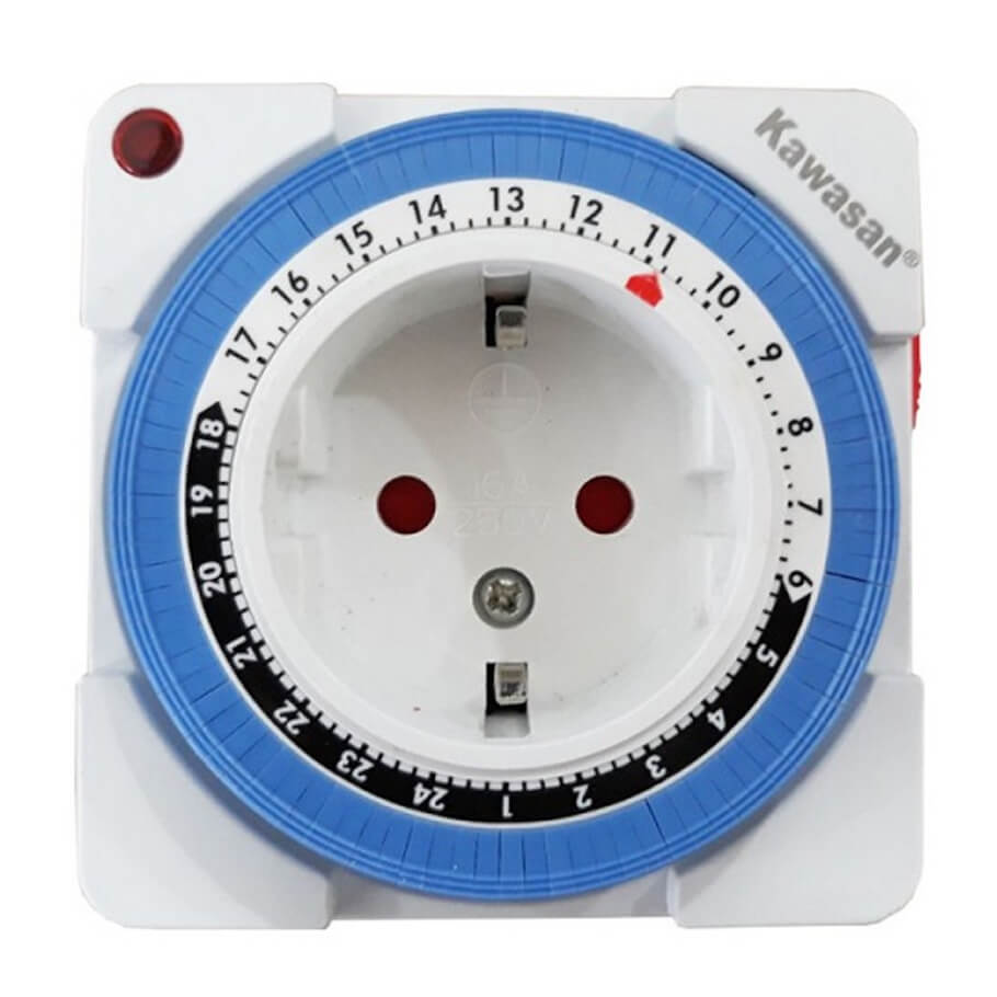 - Đây là loại công tắc thời gian dạng cơ (hay còn gọi là Timer 24 giờ dạng cơ), trên mặt đồng hồ có mũi tên chỉ thời gian thực tế và khi cắm vào ổ điện đồng hồ sẽ bắt đầu làm việc, nếu cúp điện đồng hồ sẽ ngưng chạy và phải xoay lại đồng hồ về thời gian thực tế để làm thiết bị làm việc theo chương trình đã cài đặt.