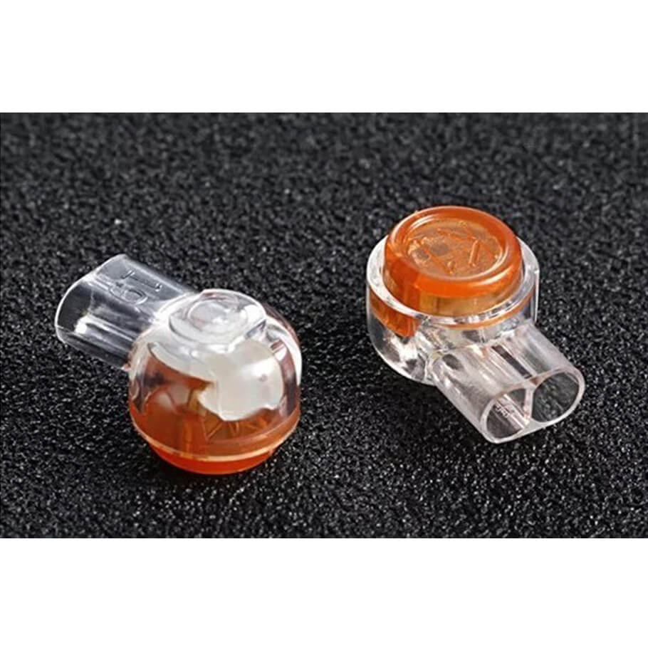 - Đấu nối cực kỳ đơn giản: Chỉ cần đưa hai dây dẫn vào cổng, sau đó dùng kìm ép nút màu vàng, không cần tuốt lớp cách điện.