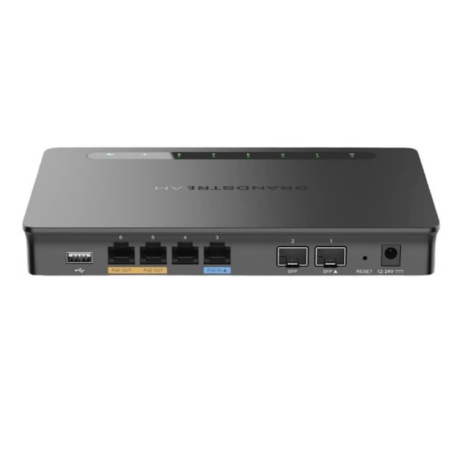 - GWN7002 được trang bị 2 cổng SFP 2.5GbE và 4 cổng Gigabit Ethernet, cho phép doanh nghiệp xây dựng hệ thống mạng tốc độ cao và dễ mở rộng. Tất cả các cổng đều hỗ trợ cấu hình linh hoạt WAN/LAN, giúp tối ưu kiến trúc mạng theo nhu cầu thực tế. Với khả năng nhận nguồn PoE Input 802.3af/at và cung cấp 2 cổng PoE Output (48V Passive hoặc 802.3af), thiết bị có thể cấp nguồn trực tiếp cho camera IP, Access Point hoặc thiết bị mạng khác, giảm bớt dây nguồn và tiết kiệm chi phí triển khai.
