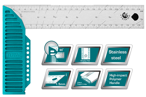 - Thiết đo góc vuông với gờ thước thiết kế độc đáo. Tay cầm nhựa polyme chịu lực cao.