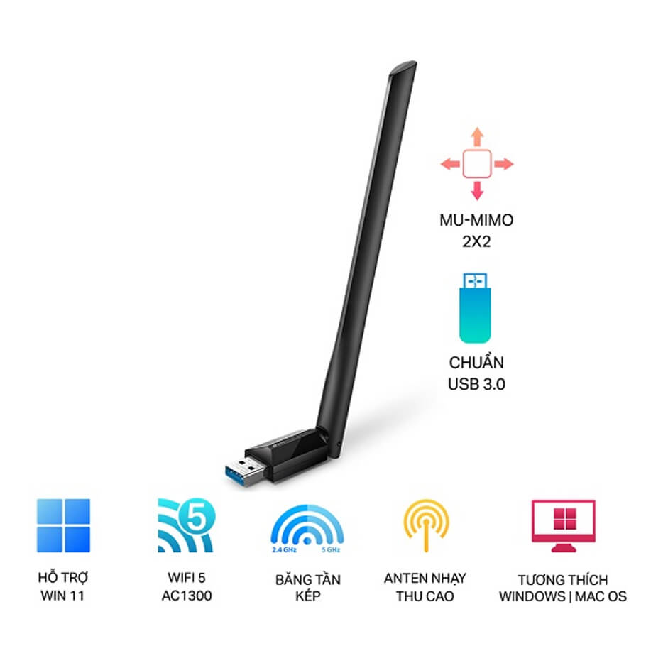 Archer T3U Plus là bộ chuyển đổi USB Wi-Fi băng tần kép AC1300 với tốc độ cao, giúp laptop, PC hoặc máy tính để bàn của bạn kết nối Internet ổn định và nhanh chóng. Sản phẩm hỗ trợ băng tần 2.4 GHz và 5 GHz, kèm công nghệ MU-MIMO, tối ưu hóa hiệu suất mạng và cải thiện lưu lượng đồng thời cho nhiều thiết bị. Ăng-ten ngoài độ lợi cao tăng cường cường độ tín hiệu, mở rộng phạm vi phát sóng. Thiết bị tương thích với hầu hết hệ điều hành mới nhất, dễ dàng cắm và sử dụng ngay lập tức.